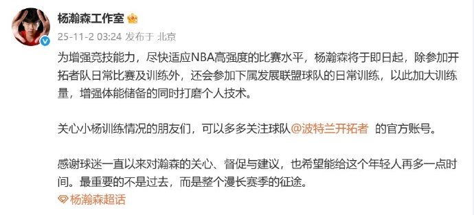 杨瀚森工作室发布声明:感谢球迷一直以来对瀚森的关心、督促与建议,也希望能给这个年轻人再多一点时间。最重要的不是过去,而是整个漫长赛季的征途。